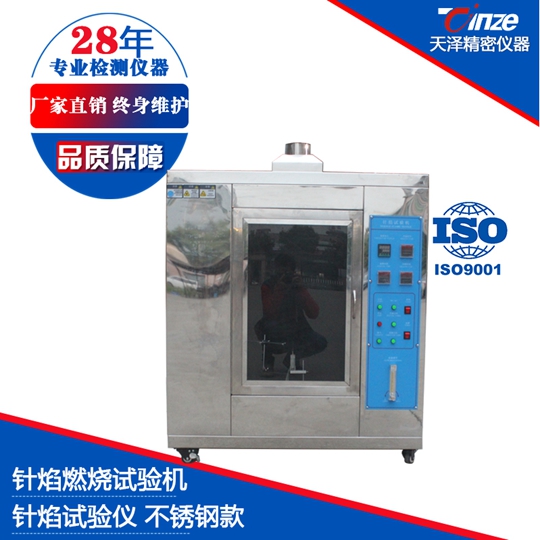 針焰試驗儀是用規(guī)定尺寸(Φ0.9mm )的針狀燃燒器,通以特定燃?xì)?丁烷),以 45°角定時定向施燃試品,視試品是否引燃及持燃時間和燃燒長度來評定設(shè)備內(nèi)部因故障條件造成的小火焰的著火危險性。
